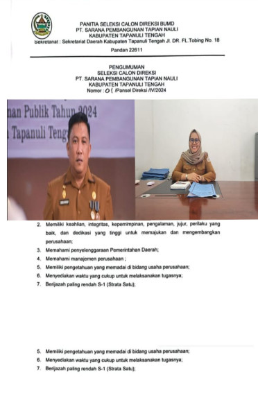 Tapteng, Indonesiaclik.com ll , Berdasarkan keputusan Bupati Tapanuli Tengah, 463/EKBANG/2024, tentang Pembentukan Panitia Seleksi Komisaris dan Direksi PT Sarana Pembangunan Tapian Nauli Kabupaten Tapanuli Tengah dan Keputusan Bupati Kabupaten Tapanuli Tengah, nomor : 539/EKBANG/2024, tentang Pembentukan Tim Seleksi Komisaris dan Direksi PT Sarana Pembangunan Tapian Nauli Kabupaten Tapanuli Tengah, mengundang Bapak/Ibu/Saudara-saudiri, untuk mengikuti seleksi terbuka calon Direksi PT Sarana Pembangunan Tapian Nauli Kabupaten Tapanuli Tengah.