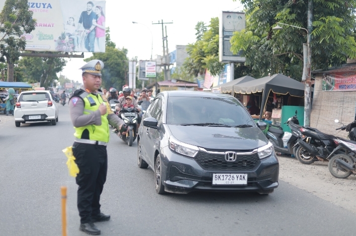 Kasat Lantas Polres Labuhanbatu AKP Johan Kurniawan, SIK tampak turun langsung mengatur lalulintas yang padat pasca arus balik Mudik Hari Raya Idul Fitri 1445 H.