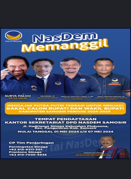 Samosir, indonesiaclik.com ll , Dewan Pimpinan Daerah (DPD) Partai Nasdem Kabupaten Samosir, membuka pendaftaran Bakal calon Bupati dan Wakil Bupati (Cabub/Cawabub) Kabupaten Samosir, pada pilkada serentak Tahun 2024.