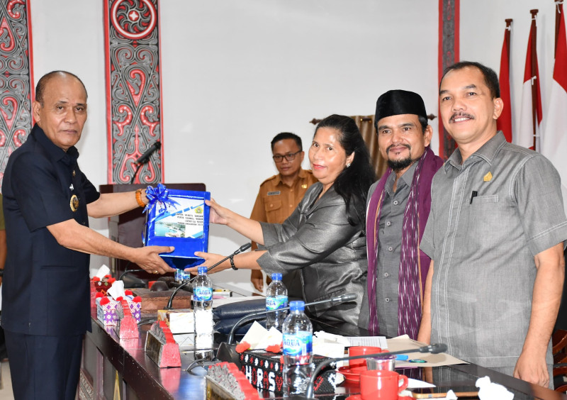 Samosir, indonesiaclik.com ll , Wakil Bupati Samosir Martua Sitanggang membacakan nota pengantar laporan keterangan pertanggungjawaban Tahun Anggaran 2023, selanjutnya dokumen LKPJ diserahkan  kepada Ketua DPRD Kabupaten Samosir Sorta E. Siahaan didampingi Wakil Ketua Nasib Simbolon dan Pantas M. Sinaga di Ruang Rapat DPRD, 23/04.