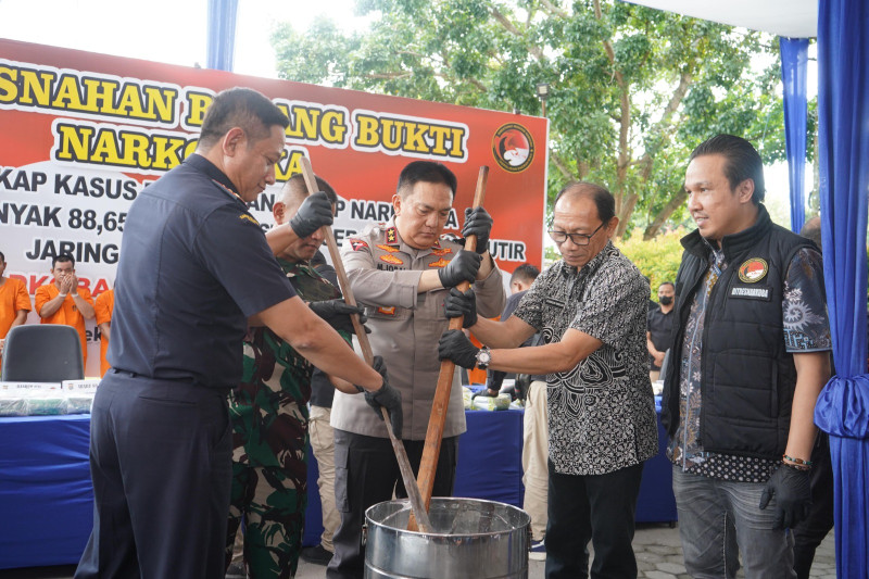 “Totalnya berjumlah 107 kilogram sabu. Kami musnahkan 88,6 kilogram sisanya 18,4 kilogram telah dimusnahkan oleh Polresta Pekanbaru dan Polres Dumai,” tambah Manang.