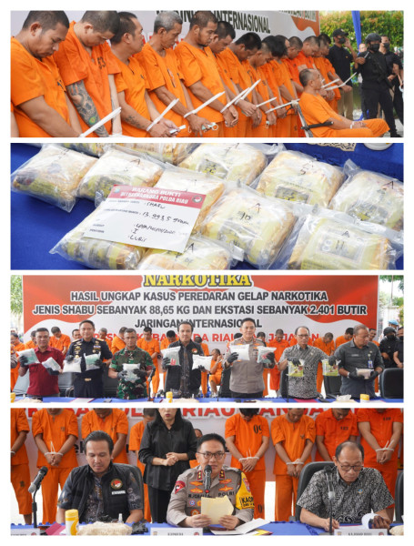 Pekanbaru -indonesiaclik,com ll , Polda Riau melaksanakan pemusnahan barang bukti narkotika hasil pengungkapan dari jaringan internasional, Jumat (26/4/2024). Barang bukti yang dimusnahkan yakni 88,65 kilogram sabu dan 2.401 butir pol ekstasi.
