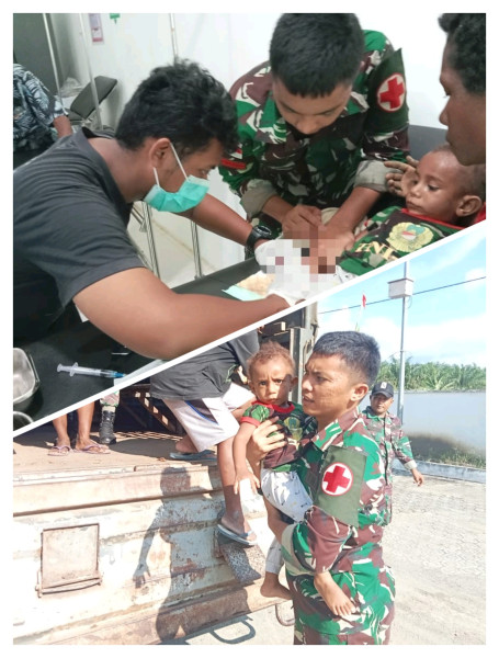 Kabupaten Keroom,indonesiaclik.com || Personel Satgas Yonif 122/TS, memberi pertolongan pertama yang mengalami luka potong di bagian Jari Tengah bagian tangan kanan akibat Terkena Parang Saat bermain, di Kampung Scofro Distrik Arso timur, Kabupaten Keerom, Papua, Rabu (29-05-2024).