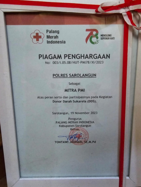 Diterimanya piagam penghargaan sebagai relawan pendonor darah aktif dari Palang Merah Indonesia (PMI) cabang Sarolangun kita harapkan dengan melakukan Donor darah Rutin oleh personil aktif diharapakan membantu warga yang membutuhkan.