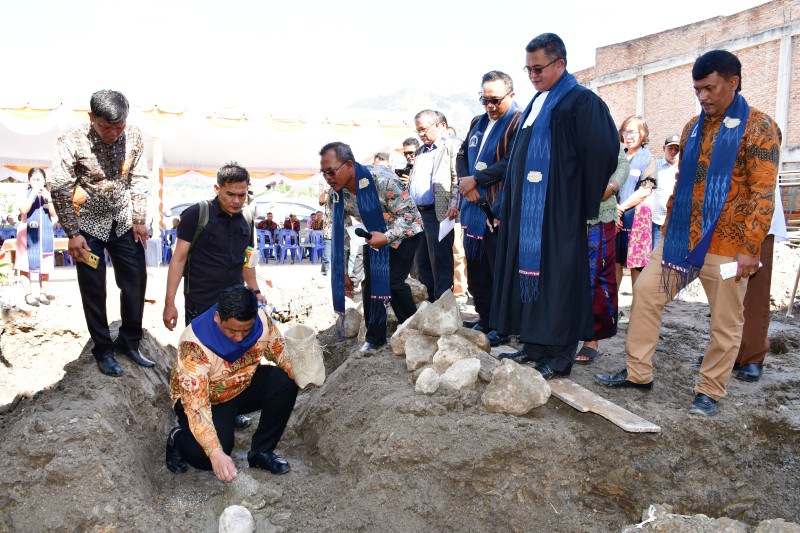 Samosir, indonesiaclik.clom ll , Bupati Samosir Vandiko T. Gultom meletakkan batu pertama pembangunan gedung konsistori, sekolah Minggu dan pembangunan kamar mandi gereja HKBP Onan Baru, 23/06.