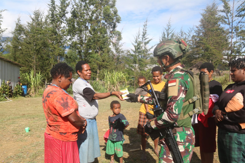 Ilaga, indonesiaclik.com -Prajurit TNI Satgas Mobile Yonif 323/BP membagikan bantuan sembako kepada warga di Kampung Kago, Distrik Ilaga, Kabupaten Puncak, Papua, Sabtu (22/06/2024).