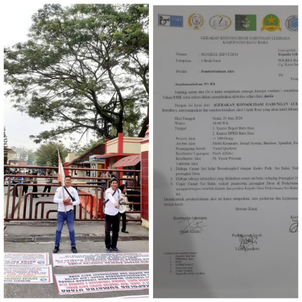 Batu-Bara, indonesiaclik.com || Puluhan media dan beberapa lembaga menanggapi adanya isu aksi demo yang mengatasnamakan, “Gerakan Konsolidasi Gabungan Lembaga Kabupaten Batu Bara” yang akan digelar pada Senin 24 Juni yang akan datang menjadi pertanyaan besar??!!, dikarenakan adanya 7 Logo Lembaga tercantum dalam surat pemberitahuan aksi sementara yang menandatangani hanya 3 orang tanpa membubuhkan Stempel ke 7 lembaga tersebut, pada Kamis.(20/06/2024)