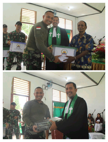 Maybrat,indonesiaclik.com || Satgas Pamtas Kewilayahan Yonif 623/BWU Pos Kotis Kumurkek dipimpin Dansatgas Letkol Inf Dimas Yamma Putra beserta anggota lainnya melaksanakan kegiatan ibadah bersama masyarakat di GKI Sion Kumurkek di Distrik Aifat, Kabupaten Maybrat, Papua Barat Daya, Minggu (09/06/2024).