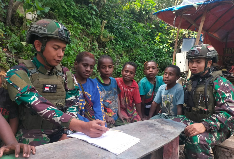 Milawak, indonesiaclik.com || Bentuk kepedulian Satgas Mobile Yonif 323 Buaya Putih dalam membangun generasi muda Papua, terutama anak-anak agar berguna untuk bangsa dan negara, salah satunya dengan menggelar kegiatan belajar sambil bermain di Sekolah Darurat Pos Beoga, yang berlokasi di Kampung Milawak, Distrik Beoga, Kabupaten Puncak, Papua Tengah, Sabtu (13/07/2024)