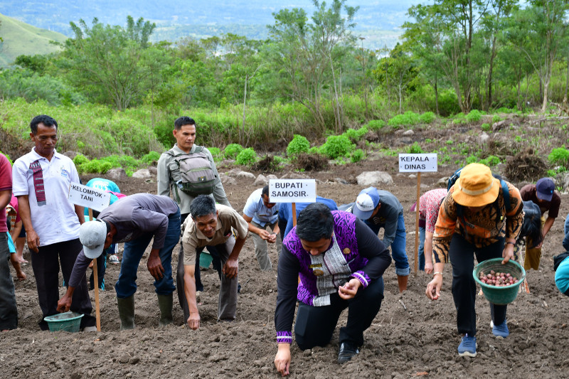 “Hari ini, kita lakukan penanaman bersama Bupati Samosir dengan kelompok tani Bersama Desa Hariara Pohan”, ujarnya.