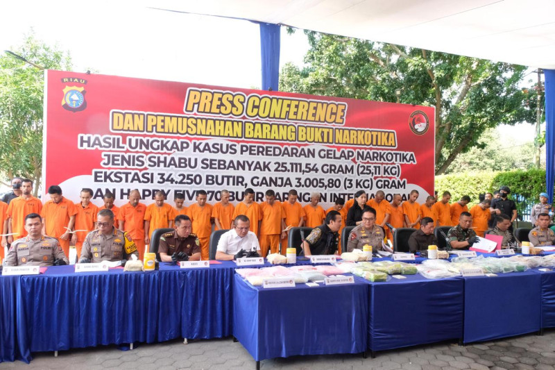 Didampingi Direktur Reserse Narkoba Polda Riau Kombes Manang Soebeti, Kapolda Riau Irjen M Iqbal mengatakan, total ada 25 tersangka yang diamankan. 17 tersangka diringkus Ditresnarkoba Polda Riau dan 8 tersangka diamankan Polres Bengkalis. Seluruh narkoba tersebut merupakan hasil operasi satu Polda Riau dan jajaran dalam satu bulan terakhir.
