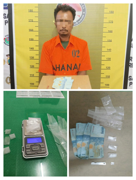 Dalam proses Interogasi awal dan penggeledahan badan serta tempat kejadian (tepatnya di depan rumah pelaku), ditemukan Barang Bukti berupa 3 bungkus klip bening paket sedang berisi serbuk kristal putih diduga sabu, 1 bungkus plastik bening paket kecil berisi serbuk kristal putih diduga sabu, 5 plastik es mambo, 1 buah pisau lipat, dan uang tunai sebesar Rp. 200.000,-. Pelaku dan Barang Bukti segera dibawa ke Satuan Reserse Narkoba Polres Sibolga untuk penyidikan lebih lanjut.