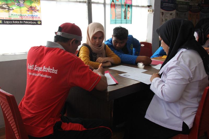 Pekanbaru, indonesiaclik.com ll , Warga Binaan Pemasyarakatan (WBP) Lembaga Pemasyarakatan (Lapas) Kelas IIA Pekanbaru mengikuti Penelitian Kemasyarakatan (litmas) yang dilaksanakan oleh Pembimbing Kemasyarakatan (PK) dari Balai Pemasyarakatan (Bapas) Kelas II Pekanbaru yang bertempat di ruang kunjungan. 4 orang PK Bapas melakukan Litmas terhadap 4 orang WBP pada hari Rabu (24/07).