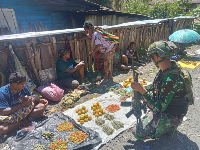 Prajurit Yonif 323 Buaya Putih Pos Beoga setiap minggunya menyerbu pasar Beoga untuk memborong berbagai jenis sayuran yang dijual mama Papua.