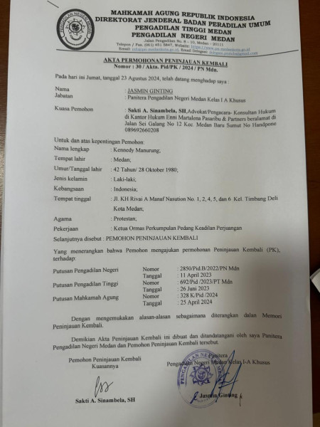 Medan , indonesiaclik.com ll , Kennedy Manurung telah resmi mengajukan Akta Peninjauan Kembali (PK) terkait kasus yang dihadapinya. Informasi ini disampaikan langsung oleh Kennedy kepada awak media, Kamis (30/8), saat ditemui di Rutan Tanjung Kusta.
