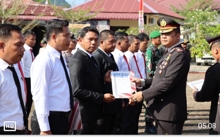 Tapteng , indonesiaclik.com ll , Kapolres Tapanuli Tengah AKBP Basa Emden Banjarnahor, SIK, MH berikan piagam penghargaan kepada personil Polres Tapteng, Personil TNI AD Koramil Pinangsori dan ASN Dinas Pendidikan Pemkab. Tapteng.