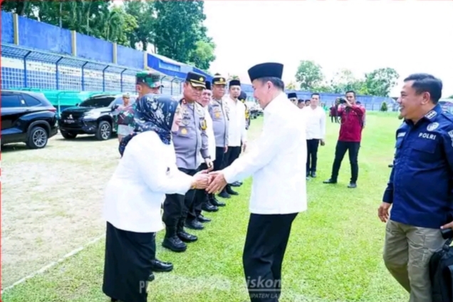Pelaksana tugas (Plt) Bupati Labuhanbatu Hj. Ellya Rosa Siregar S.Pd., MM bersama Kapolres Labuhanbatu AKBP. Dr. Bernhard L Malau S.I.K. M.H, dan Dandim 0209/LB Letnan Kolonel Inf Yudy Ardiyan Saputro, S.I.P. menyambut kunjungan Pj. Gubernur Sumatera Utara Dr. Drs. A. Fatoni, M.Si, di Stadion Binaraga. Rabu (28/8/2024).