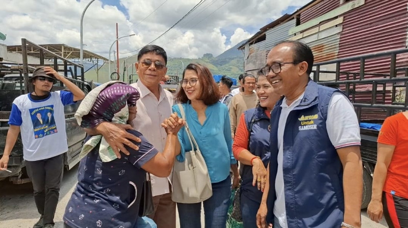 Samosir, indonesiaclik.com || Hari pertama kampanye damai Ariston Tua Sidauruk,SE, MM Calon Wakil Bupati Samosir pasangan Calon Bupati, Vandiko Timotius Gultom, ST blusukan ke Pasar Tradisional Pangururan, Rabu (25/9/2024). Ia didampingi isteri tercintanya Kennauli boru Sinaga, tim pemenangan, mantan Wakil Bupati Samosir Ir. Juang Sinaga dan isteri boru Panjaitan.