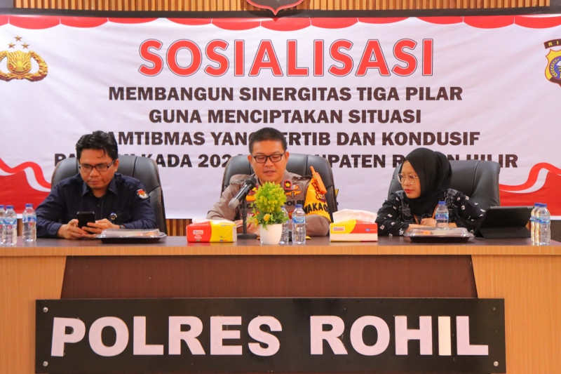Kegiatan sosialisasi membangun sinergitas tiga pilar guna menciptakan situasi kamtibmas yang tertib dan kondusif pada Pilkada 2024 di Kabupaten Rokan Hilir selesai sekira Pukul 10.45 Wib, selama kegiatan berlangsung aman dan kondusif.