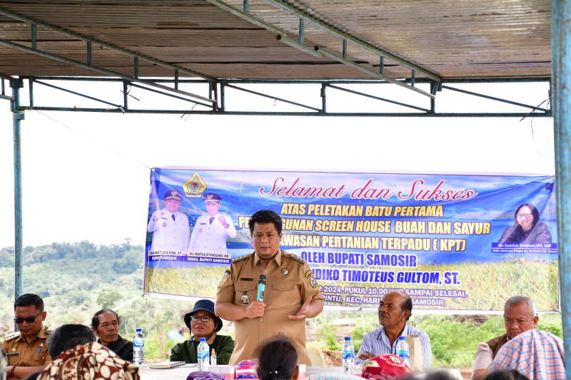 Samosir, indonesiaclik.com ll Kawasan Pertanian Terpadu (KPT) terus dikembangkan Pemkab Samosir. Selain membantu bibit dan alat pertanian, kali ini dilengkapi dengan Screen House buah dan sayur sekaligus untuk budidaya strowbery. Bupati Samosir Vandiko T. Gultom secara resmi meletakkan batu pertama dimulainya pembangunan Screen House di KPT Desa Hariara Pintu-Kecamatan Harian, 09/09.
