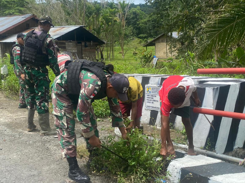 Kabupaten Keerom, indonesiaclik.com || Satgas pamtas RI-PNG Yonif 122/TS Pos Kalibom bersama pemuda Kampung Kalibom menggelar karya bhakti membersihkan kanan kiri jalan yang ada di Kampung Kalibom, Distrik Waris, Kabupaten Keerom, Papua, Selasa (10-09-24).