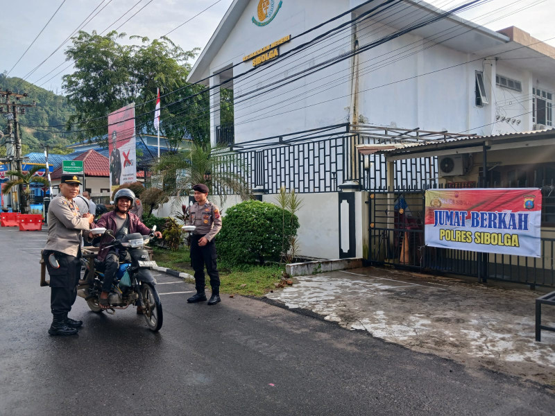 SIBOLGA , indonesiaclik.com ll Dalam rangka Jumat Berkah, Polres Sibolga bagikan Nasi dijalan Raya. Agar mengetahui apa saja informasi saran dari warga untuk Kamtibmas selalu kondusif di Kota Sibolga, Kapolres Sibolga AKBP Achmad Fauzy, SH, SIK, MIK, diwakili Kasat Binmas Polres Sibolga IPTU Martua Sinaga, bersama Personil Polres Sibolga, melaksanakan kegiatan Jumat Berkah dengan membagikan Nasi kepada warga yang melintas dijalan dan menyapa dengan humanis, sehingga warga dapat menyampaikan masukan saran kepada Polres Sibolga, untuk Kamtibmas agar terjaga dengan baik dan kondusif.