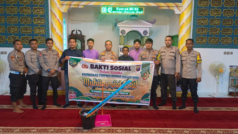 KUANSING (RIAU), indonesiaclik.com ll Polsek Cerenti laksanakan bakti sosial pembinaan terpadu dalam rangka menyambut Maulid Nabi Muhammad SAW 1446 H Tahun 2024 M, di Masjid Raudhatul Jannah desa Kampung Baru, Jumat, (14/9/24), sekira pukul 08.30 WIB.