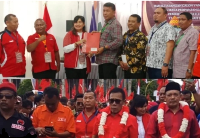 Plt Ketua DPC PDI-Perjuangan Kabupaten Tapanuli Tengah, Sarma Hutajulu didampingi Ketua Partai Buruh Tapteng, Tao Junjungan Sianipar, menyerahkannya dokumen pendaftaran kepada Ketua didampingi komisioner KPU