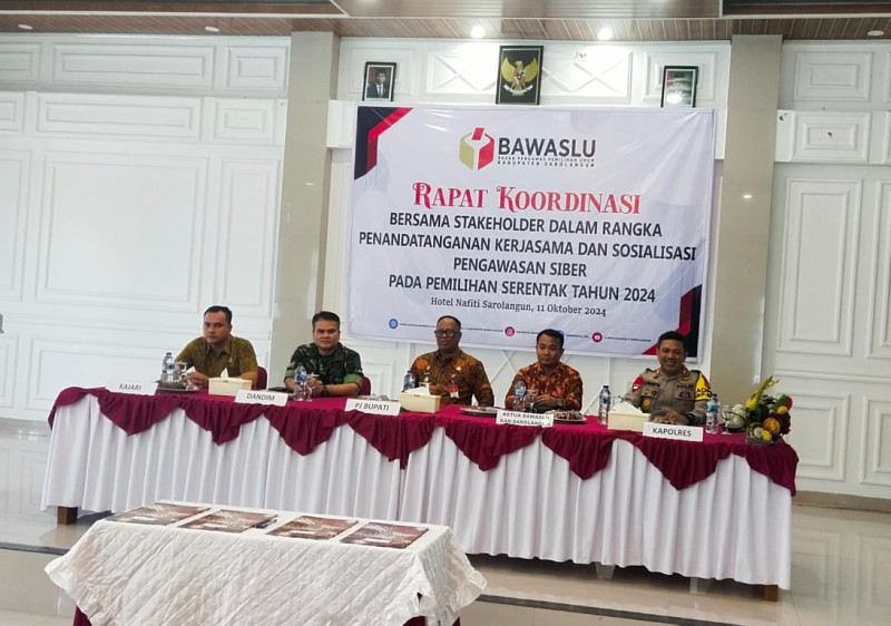Sarolangun, indonesiaclik.com ||  Badan Pengawas Pemilihan Umum (Bawaslu) Kabupaten Sarolangun menggelar Rapat Koordinasi (Rakor) Bersama Stakeholder Dalam Rangka Penandatanganan Kerjasama dan Sosialisasi Pengawasan Siber Pada Pemilihan Serentak Tahun 2024, di Aula Hotel Nafiti, Jumat (11/10/2024).