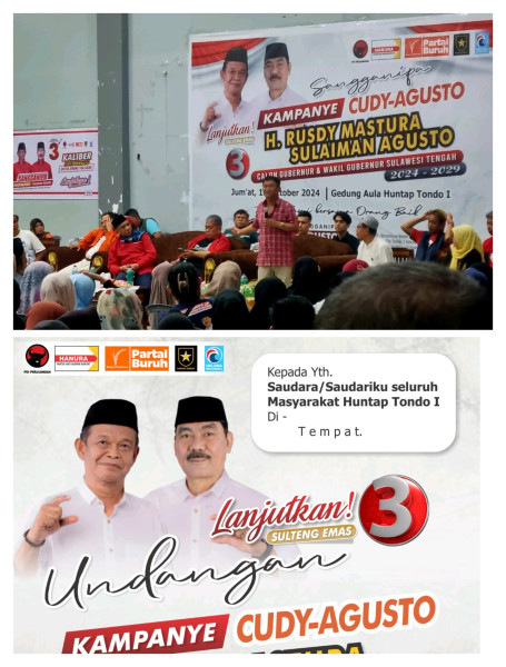 Palu, Indonesia Lik.com || 19 Oktober 2024* – Pasangan calon gubernur dan wakil gubernur Sulawesi Tengah, Rusdy Mastura-Sulaiman Agusto Hambuako (CUDY-SAH), melaksanakan kampanye di Hunian Tetap (Huntap) Tondo, Palu, pada Jumat malam (18/10/2024).