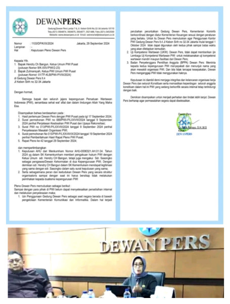 Dari hasil Pleno Dewan Pers ke-42 yang dilaksanakan pada 29 September 2024, Dewan Pers memutuskan: