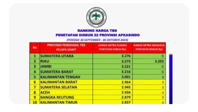 Merujuk data yang diterbitkan APKASINDO periode 30 September – 6 Oktober 2024, Sumatera Utara bertengger di posisi puncak dengan harga TBS Sawit Rp 3.276/kg. Disusul Riau sebesar Rp 3.275/kg dan Jambi sebesar Rp 3.221/kg.