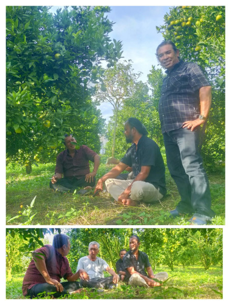 Pohon jeruknya sedang masa panen seluas 5 hektar. Mereka berbincang tentang bagaimana cara menanam jeruk agar hasilnya memuaskan.