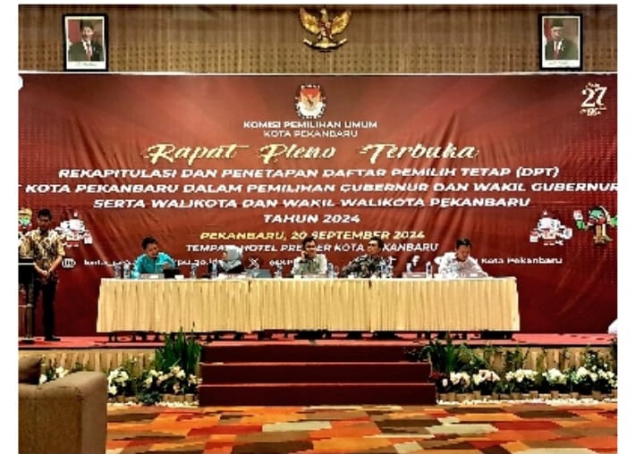 PEKANBARU ,indonesiaclik.com ll Komisi Pemilihan Umum (KPU) Pekanbaru menetapkan Daftar Pemilih Tetap (DPT) Pemilihan Gubernur dan Wakil Gubernur serta Walikota dan Wakil Walikota Pekanbaru tahun 2024 sebanyak 791.034 pemilih. DPT tersebut ditetapkan dalam pleno terbuka rekapitulasi, Jumat (20/9/2024) di Hotel Premier Pekanbaru.