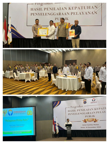 SIBOLGA , indonesiaclik.com ll Polres Sibolga berhasil meraih Penghargaan Kategori A (Kualitas Tertinggi) dalam Penilaian Kepatuhan Penyelenggaraan Pelayanan Publik Tahun 2024 yang diselenggarakan oleh Ombudsman Republik Indonesia. Penyerahan penghargaan berlangsung pada Senin (16/12/2024), di Hotel Santika Premiere Dyandra Medan.
