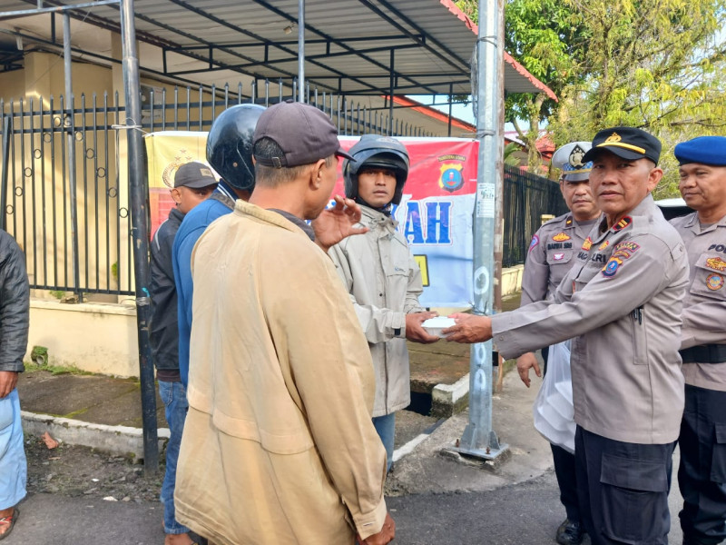 SIBOLGA , indonesiaclik.com ll Dalam rangka Jumat Berkah, Polres Sibolga bagikan Nasi dijalan Raya. Agar mengetahui apa saja informasi saran dari warga untuk Kamtibmas selalu kondusif di Kota Sibolga, Kapolres Sibolga AKBP Achmad Fauzy, SH, SIK, MIK, diwakili Kasat Binmas Polres Sibolga IPTU Martua Sinaga dan Kasat Narkoba Polres Sibolga IPTU Rahmad R. Hutagaol, SH, MH, Kanit Regident Sat Lantas IPDA Marwa Siregar, bersama Personil Polres Sibolga, serta Pengurus Bhayangkari Cabang Sibolga, melaksanakan kegiatan Jumat Berkah dengan membagikan Nasi kepada warga yang melintas dijalan dan menyapa dengan humanis, sehingga warga dapat menyampaikan masukan saran kepada Polres Sibolga, untuk Kamtibmas agar terjaga dengan baik dan kondusif Pasca Pilkada Serentak Tahun 2024, di Kota Sibolga.