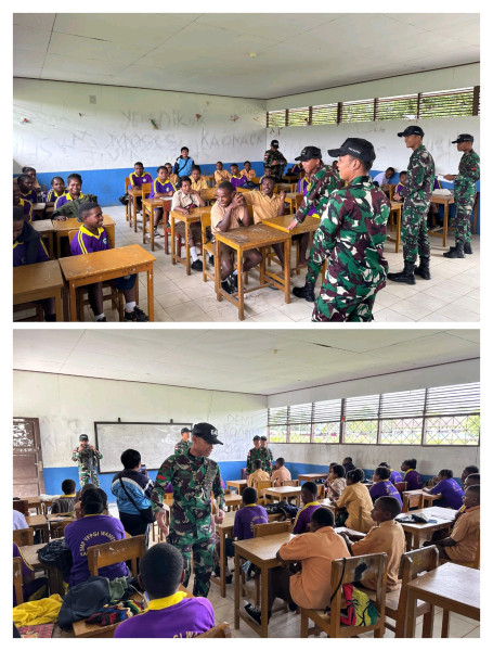 Jayawijaya, indonesiaclik.com || Pos Napua Satgas Yonif 641/Bru menunjukkan kepedulian terhadap anak-anak sekolah yang berada di Distrik Wamena, melalui Tim Tenaga pendidik Pos Napua membantu mengajar siswa-siswa SMP YPPGI ANIGOU, Kampung Hurekama, Distrik Wamena, Kabupaten Jayawijaya, Propinsi Papua Pegunungan, (29/01/2025).