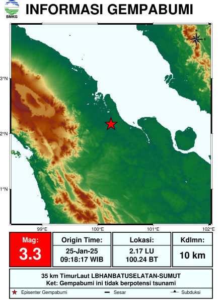 Informasi Gempa dengan kekuatan Mag 3.3 Guncang daratan Labuhan Batu Selatan, Sumatera Utara ini terlihat hasil pantuan awak media melalui Kanal website www.bmkg.go.id atau inatews.bmkg.go.id dan dikuatkan informasi dan foto yang masuk dari pesan Grup WhatsApp Media (Info BMKG SU) adanya Gempa Mag 3.3 yang menguncang wilayah daratan Labuhan Batu Selatan, itu, namun Gempa Bumi tersebut tidak berpotensi sunami.