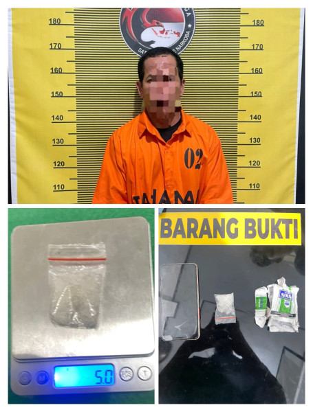 Dari hasil penggeledahan, petugas menemukan barang bukti berupa satu paket sedang berisi serbuk kristal yang diduga sabu dengan berat bruto 5,0 gram. Selain itu, turut diamankan pula satu unit telepon genggam Android merk Oppo dan satu kotak rokok Union yang digunakan untuk menyimpan Narkotika tersebut.