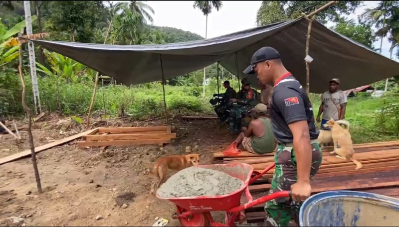 Kaimana, indonesiaclik.com || Pos Teluk Etna Satgas Yonif 642/Kps bersama warga kampung Rurumo gotong royong membangun rumah bapak Paulus warga RT 3 kampung kiruru. Distrik Teluk Etna, Kabupaten Kaimana. Provinsi Papua Barat. (31/1/2025).