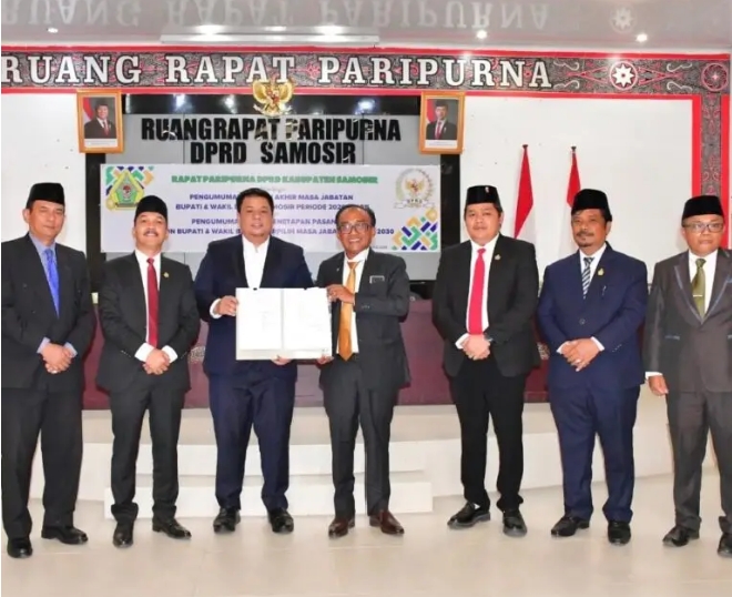 SAMOSIR ,indonesiaclik.com ll Dewan Perwakilan Rakyat Daerah (DPRD) Kabupaten Samosir menggelar sidang paripurna untuk mengumumkan penetapan Bupati dan Wakil Bupati Samosir terpilih masa jabatan 2025-2030, hasil pemilihan kepala daerah (Pilkada) 2024 di Gedung Paripurna DPRD Samosir, Selasa (11/2/2025).