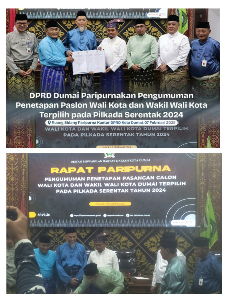 “Atas rahmat Allah SWT Tuhan YME, kita dapat menghadiri rapat Paripurna DPRD Kota Dumai dalam rangka Pengumuman Penetapan Pasangan Calon (Paslon) Wali Kota dan Wakil Wali Kota Dumai Terpilih Periode 2025-2030 pada Pilkada Serentak Tahun 2024,” ungkapnya.