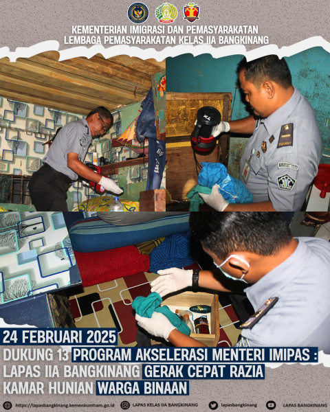 Dalam rangka menindaklanjuti Arahan 13 (tiga belas) Program Akselerasi Menteri Imigrasi dan Pemasyarakatan, Bapak Agus Andrianto khususnya pada poin 1 (satu) yakni Memberantas Peredaran Narkoba dan Pelaku Penipuan dengan berbagai modus di Lapas dan Rutan, Lembaga Pemasyarakatan (Lapas) Kelas IIA Bangkinang Khususnya Tim Satopspatnal kembali ambil tindak cepat lakukan razia rutin kamar hunian warga binaan, yang Kali ini, Razia dilakukan di Blok G Kamar 02, Senin (24/02/2025).