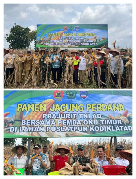 OKU TIMUR, indonesiaclik.com ||Komandan Puslatpur Kodiklatad Brigjen TNI Dany Rakca S.A.P M.Han bersama Pj Bupati OKU Timur didampingi Kadis Pertanian dan Perkebunan serta pejabat Kodim, Polres dan Petani melaksanakan Panen Jagung Perdana di Lahan Pertanian Danpuslatpur, Selasa, (11/2/2025).