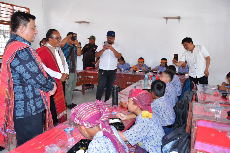 Samosir, indonesiaclik.com || Mendukung program Presiden Prabowo, Bupati Samosir, Vandiko T. Gultom bersama DPC Gerindra Kabupaten Samosir memberikan makanan gratis kepada siswa SMP N 1 Pangururan. Kamis, (6/2/25)