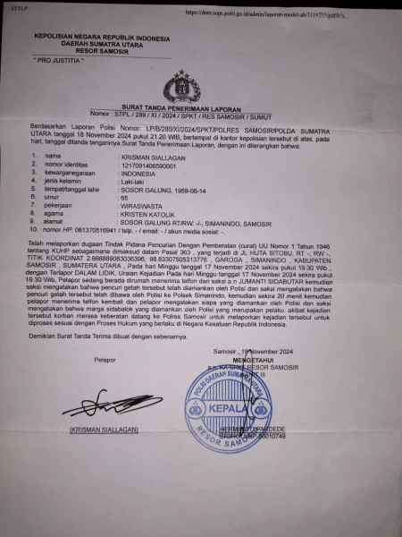 Samosir, indonesiaclik.com || Krisman Siallagan (66) warga Kecamatan Simanindo telah melapor ke Polres Samosir pada 18 November 2024 pukul 21.20 WIB. Laporan tersebut teregister dengan Nomor STPL/289/XI/2024/SPKT/RES SAMOSIR/POLDA SUMATERA UTARA dengan dugaan tindak pidana pencurian dengan pemberatan, sesuai dengan Pasal 363 KUHP dalam UU No. 1 Tahun 1946. Krisman Siallagan merupakan Ketua Koperasi Jasa Parna Jaya Sejahtera, mereka beranggotakan ratusan orang dan melakukan penderesan getah pinus dikawasan hutan atas ijin dari Kementrian Kehutanan.