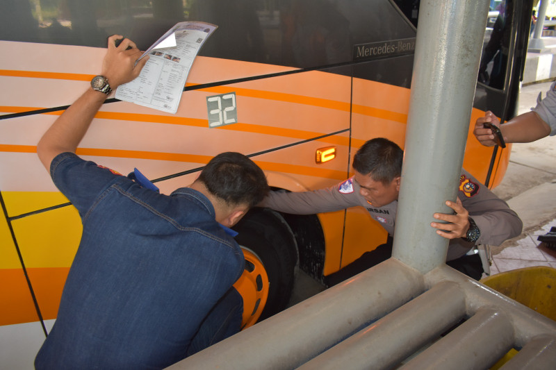 Satgas Preventif satlantas Polresta Pekanbaru melakukan pemeriksaan kondisi kendaraan untuk memastikan para kendaraan dalam keadaan layak jalan jarak jauh.
