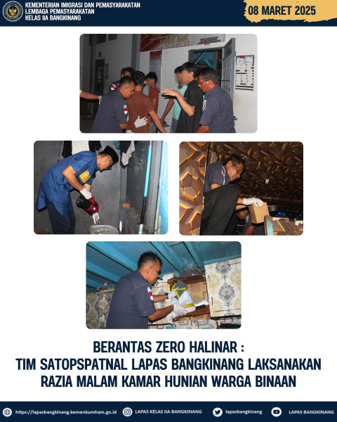 *BANGKINANG* , indonesiaclik.com ll Dalam rangka menindaklanjuti Arahan 13 (tiga belas) Program Akselerasi Menteri Imigrasi dan Pemasyarakatan, Bapak Agus Andrianto khususnya pada poin 1 (satu) yakni Memberantas Peredaran Narkoba dan Pelaku Penipuan dengan berbagai modus di Lapas dan Rutan, Lembaga Pemasyarakatan (Lapas) Kelas IIA Bangkinang Khususnya Tim Satopspatnal gerak cepat menggelar razia insidentil yang Kali ini razia dilakukan di salah satu kamar hunian warga binaan, Sabtu malam (07/03/2025).