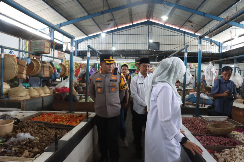 Kombes Pol Rama berkeliling pasar memantau harga Bapokting mulai dari harga daging ayam, daging sapi, beras, minyak goreng, hingga bawang dan cabai.