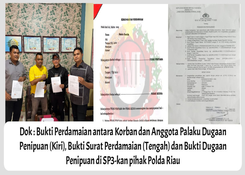 PEKANBARU, indonesiaclik.com || Dugaan Penipuan yang diduga dilakukan Mirwansyah, dan dilaporkan oleh Jetro Sitorus sebagai Pelapor berdasarkan laporan bernomor :LP/B/483/XII/2023/SPKT/Polda Riau, tertanggal 19 Desember 2023 lalu.Dihentikan pihak Penyidik Dirreskrimum Polda Riau,berdasarkan Surat Ketetapan dengan nomor : SK Lidik/09/III/Res.1.11/2025 tertanggal 20 Maret 2025.